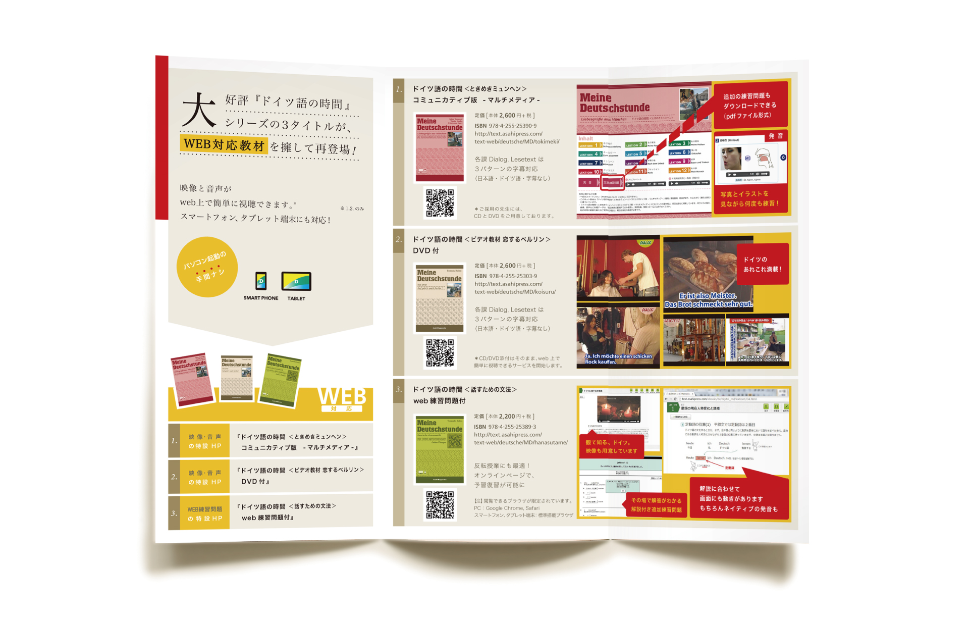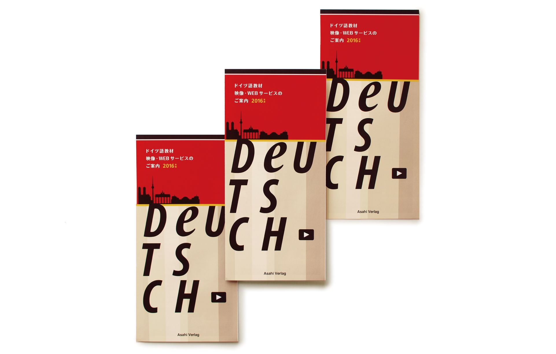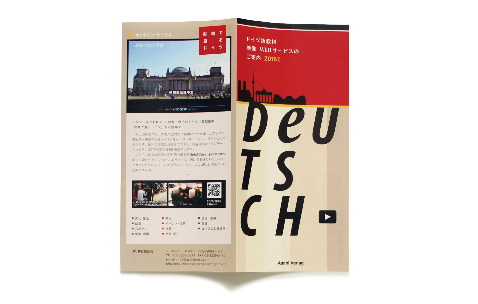 Asahi Press is a publisher established in 1962 and it publishes anything from general books to textbooks. We produced an A4 flyer about a web-supported version and videos for a German language course series for universities. The ‘play (video)’ icon with the colours of the German flag on the cover indicate that the flyer is about videos and the web. The rich contents were organised and designed in an easy-to-understand manner to effectively convey them.